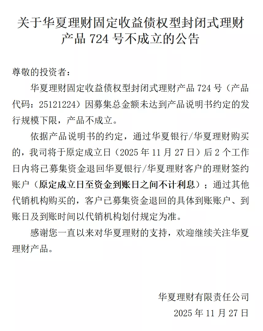 11月27日,华夏理财发布公告称,华夏理财固定收益债权型封闭式理财产品724号(产品代码:25121224)因募集总金额未达到产品说明书约定的发行规模下限,产品不成立。